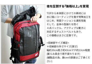 他を圧倒する「価格以上」を実現 デザインの良さはもちろん使いやすさも抜群! TOPから本体部にかけての素材には水に強いコーティングを施す特殊加工をはじめ背面クッション&通気性能そして、全体の型崩れを防ぐ4点バックル、アクティブな動きに対応するチェストベルトもあり この価格はまさに圧巻です。
