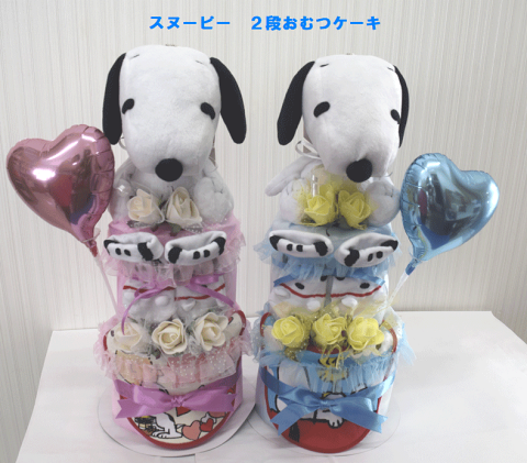 オムツケーキ出産祝い 女の子用 スヌーピーぬいぐるみ&スタイ付き2段ケーキ