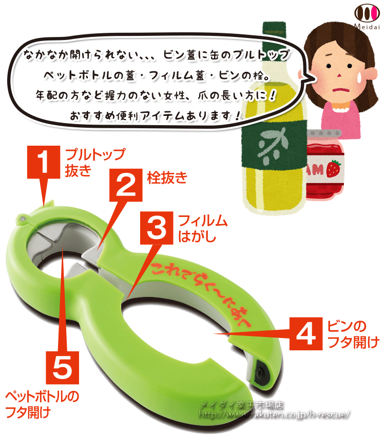 ビン蓋に缶のプルトップ・ペットボトルの蓋・フィルム蓋・ビンの栓が楽々オープン ☆