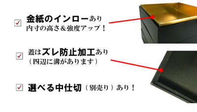 \中箱はこちらから/ 商品説明サイズ6.5寸3段 外寸192mm×192mm高178mm(蓋込)内寸185mm×185mm高45mm サイズ7寸3段外寸212mm×212mm高195mm(蓋込) 内寸202mm×202mm高53mmサイズ8寸3段 外寸250mm×250mm高195mm(蓋込)内寸240mm×240mm高53mm 材質外装内装共に紙製※電子レンジ不可、オーブン不可 商品説明中仕切は別売です。