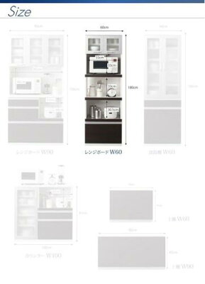 奥行41cmのモダンデザインキッチン収納◆レンジボードW60【外寸サイズ】幅60 奥行41 高さ180m【内寸サイズ】・上段オープン部分内寸幅55.5 奥行38 高さ33cm(背板あり)※1500W2口コンセント付き・中段オープン部分内寸幅55.5 奥行38 高さ32.5cm(背板なし)・下段スライド棚部分内寸幅55.5 奥行38 高さ30.5cm(背板あり)※1500W2口コンセント付き・食器収納部分内寸幅55.5 奥行38 高さ27.5cm※3cmピッチ調整、可動棚1枚付き・引出収納部分内寸幅50.5 奥行34.5 高さ30cm【製品重量】36kg【梱包サイズ/梱包重量】1梱包幅63 奥行43 高さ182cm 37kg【材質】前面:(ダークブラウン)塩ビ化粧繊維板、(ホワイト)ペット樹脂化粧繊維板側面:プリント化粧繊維板、扉:ハイグロス化粧繊維板(ホワイトのみ)、3mm厚ガラス【カラー】ダークブラウン/ホワイト【生産国】日本【完成品】※サイズ・重量は概算になります。