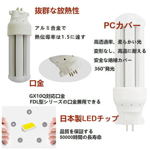 【FDL13形LED蛍光灯製品仕様】 ●品番:FDL13形・コンパクトLED蛍光灯 ●口金:GX10Q ●消費電力:6 w ●全光束:960 lm ●サイズ:48*48*115 mm ●重さ:0.09 kg ●平均演色評価数:Ra85以上 ●電源:内蔵 ●発光角度:360° ●色温度:3波長形昼光色6000K/ 昼白色5000K/白色4000K /電球色3000K ●周波数:50-60 Hz ●照明効率:90% ●入力電圧:AC100V-200V ●ノイズ対策:CISPR 15 ●ケース材質:PCカバー+放熱板材質アルミ ●定格寿命:50000時間 ●保証期間:2年 ●※ 調光機能:無 ✿オススメポイント ●防錆性鋳造アルミニウム、アルミ合金放熱+乳白色PC樹脂カバー ●50000Hの長寿命、維持費を大幅に削減し、従来の蛍光管に比べ、交換作業が大幅に省けます。