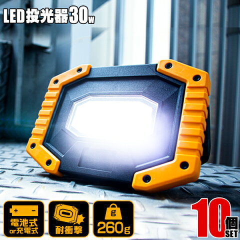 【送料無料】【10個セット】LED投光器 30W 電池式 COBチップ搭載 LED 投光器 昼光色 ledライト 作業灯 ワークライト サーチライト 3000LM USBケーブル付き 省エネ 屋内 照明 船舶 屋外 キャンプ アウトドア 送料無料